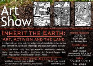 This event is a collaborative group art show featuring Indigenous artists/activists exploring their environment, land-based knowledge, and issues surrounding the land. The opening reception is Thursday (tonight), February 27th from 6-8 pm with DJ Byron Fenix. The Artist Reception is Saturday evening, March 1st, 2014 from 6-9 and features performances by poet Simon Ortiz, Artificial Red, and the Morning Star Leaders Youth Council. The show opens February 27th and runs through March 2nd, 2014 at Frontal Lobe Community Space and Gallery located at 1301 Grand Avenue, Ste. 2B, Phoenix, Arizona 85007. Artists represented include: Julius Badoni, Thomas Grey-Eyes, Randy Kemp, Lydia Maldonado, Rykelle Kemp, Dominique Hunter, Jacob Meders, Gloria Tacheenie-Campoy, Bobby Wilson, Megan LaRose, Treston Easchief, Steven Yazzie and others.